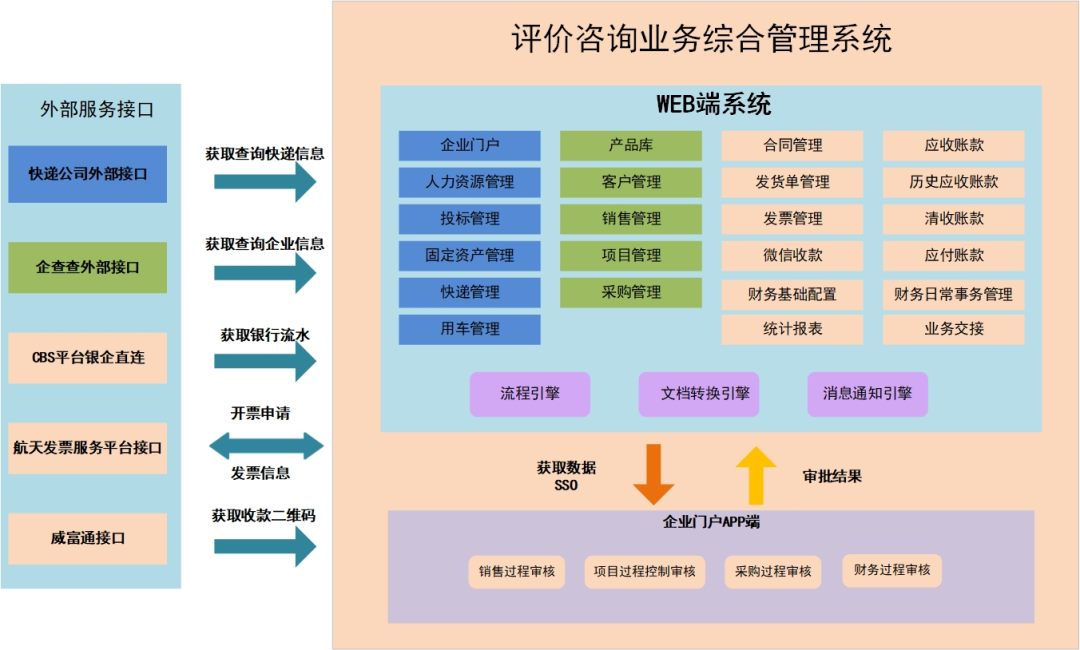 項目搭建了 “業(yè)務(wù)管理系統(tǒng)+移動門戶+客戶服務(wù)平臺”三位一體的綜合信息化管理系統(tǒng),主要包含以下功能板塊: